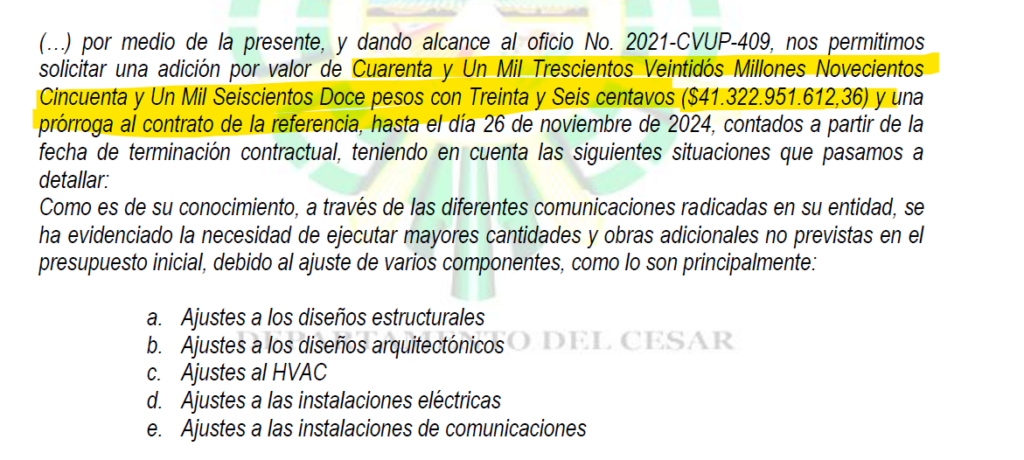 A la par de la prórroga de tiempo, el contratista solicitó una adición presupuestal de $41.322 millones para terminar la obra e implementar las modificaciones solicitadas. Según el contratista, se solicitaron mayores cantidades y obras adicionales no previstas en el presupuesto inicial, entre esos, ajustes a los diseños estructurales, arquitectónicos, instalaciones eléctricas y las instalaciones de comunicaciones, entre otras.
