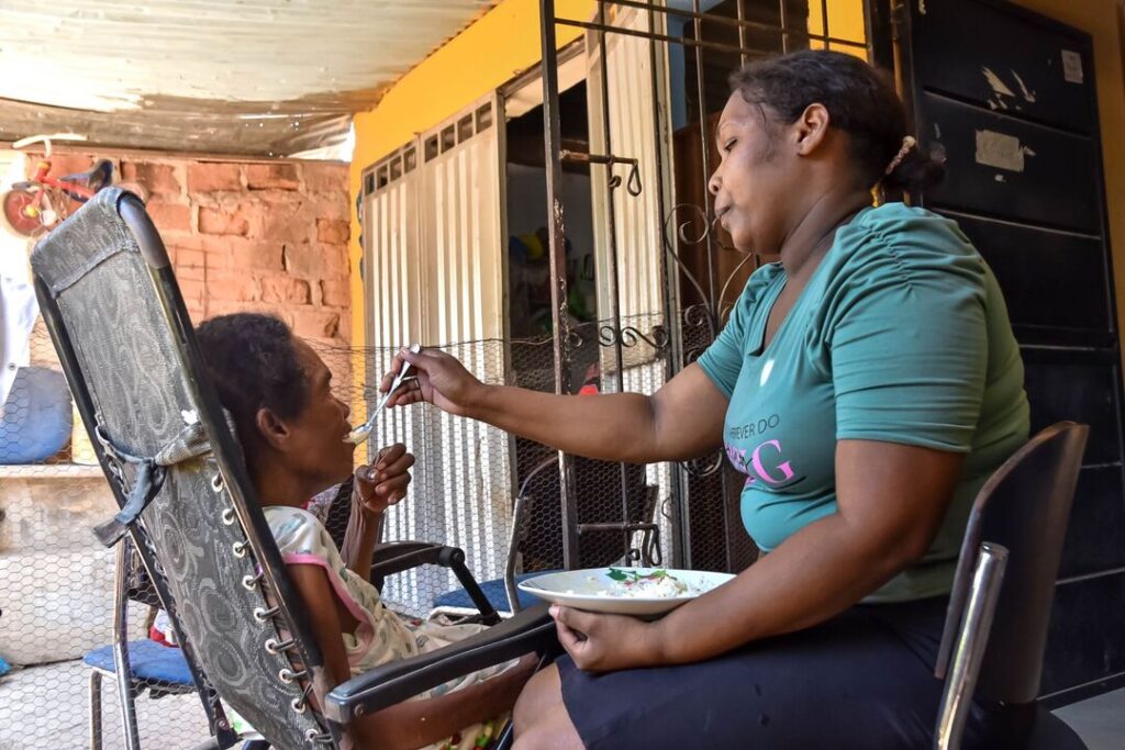 Sosteniendo el plato de comida de su madre, Hoyos aseguró al diario EL PILÓN que su mamá llora al escuchar un ruido fuerte, al ver a las personas moviéndose rápido o al presenciar alguna una situación fuera de la rutina cotidiana. “Siempre tenemos que tranquilizarla porque ella llora hasta cuando escucha un grito. Eso la altera y es producto de su enfermedad”, dijo con tristeza Hoyos mientras acariciaba la mano de su mamá.
