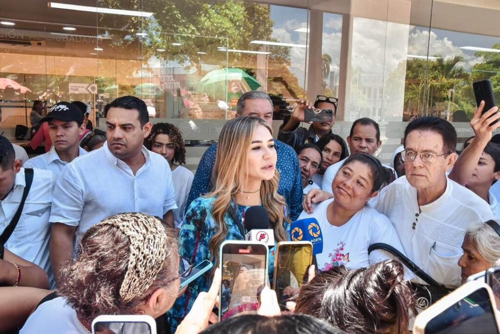 La gobernadora del Cesar, Elvia Milena Sanjuán, con un grupo de representantes de las 4 invasiones que piden intermediación del gobierno departamental. Foto: Jesús Ochoa.