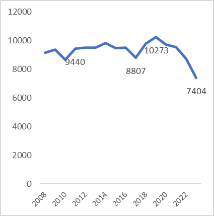 La distribución de nacimientos por año de ocurrencia en Valledupar muestra un comportamiento que debería prender alertas en los hacedores de política pública municipal. Las cifras preliminares del año 2023 reflejan un número de nacimientos sin precedentes en los últimos 15 años y, visto en retrospectiva, se evidencia una caída sistemática en este indicador desde 2019 (Gráfica 3), en razón a que en 2008 se tuvo un total 9.157 nacimientos frente los 7.404 que se registraron en el año 2023.