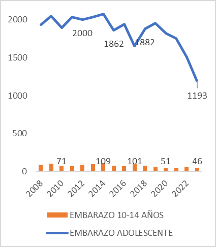 En el total de nacimientos de madres en edades entre 10-19 años sobre total de nacimientos en 2023, Bogotá exhibe un indicador de 10 %, mientras que en Valledupar esta cifra es de 16 %. En términos absolutos, Valledupar exhibe un registro en 2014 de 109 nacimientos en mujeres en edades entre 10-14 años que cae a 46 en 2023. En total de embarazo adolescente, en la ciudad nacieron 2.050 niños de madres en edades entre 10-19 años en el año 2009 y 1.193 en el año 2023. ¡La caída es pronunciada!