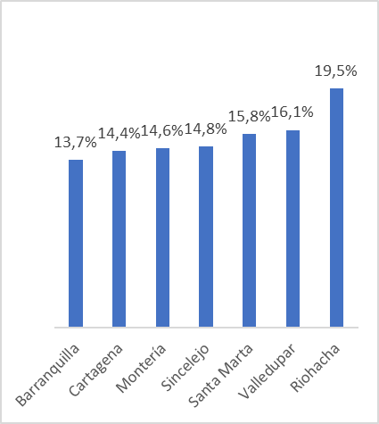 Comparada frente a las ciudades capitales del Caribe, Valledupar exhibe la segunda tasa más alta de nacimientos de mujeres adolescentes, solo superada por Riohacha (Gráfica 5), aunque refleja un indicador muy similar para el Total Nacional (16%).