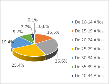 Tomando como referencia la edad de la madre, los nacimientos en Valledupar muestran que, en el año 2023, 52 % son de madres entre 20 y 29 años y 29 % en edades comprendidas entre 30 y 39 años (Gráfica 7). Para 2023, las madres en el rango de edad entre 20 y 24 años tienen el mayor número de nacimientos, con 1.878 de los 7.404 nacimientos totales.