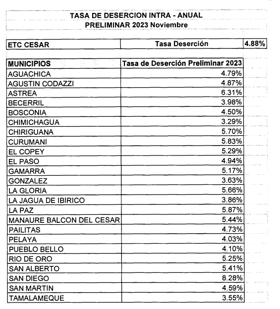 En el caso del departamento del Cesar, excluyendo Valledupar, durante el 2023 se tuvo una población de 155.783 estudiantes, con una tasa de deserción de 4,88 %. Eso significa alrededor de 7.602 estudiantes que comenzaron, pero no terminaron el año escolar en el 2023.