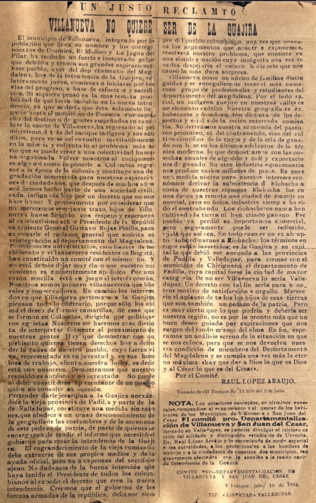 EL PILÓN, por solicitud de los lectores, publica en formato impreso el escrito del arquitecto Raúl López en 1954, acogido por la asociación de villanueveros y sanjuaneros —denominada Comité Prodepartamentalización de Villanueva y San Juan del Cesar—, que ayer fue noticia en este diario.