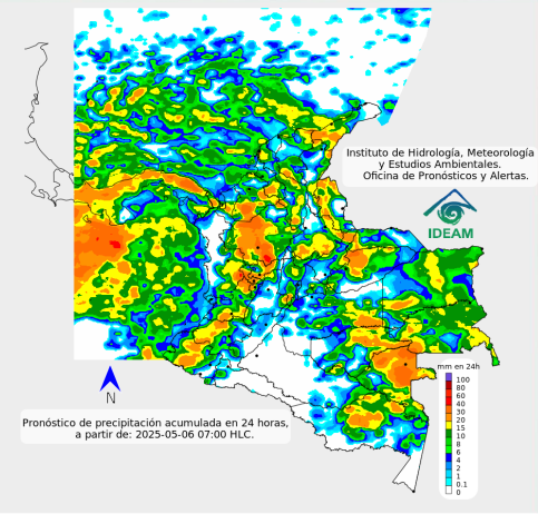 Pronóstico de lluvias del 6 y 7 de mayo. Fuente: Ideam.