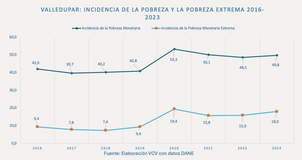 En Valledupar, el 50 % de los hogares enfrenta pobreza monetaria, y el 18 % vive en condiciones de pobreza extrema. Desafortunadamente, desde el año 2019, estos indicadores han aumentado un 5,1 % y 15,2 %, respectivamente.