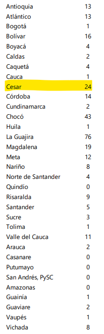 Con esta cifra, el departamento del Cesar ocupó el tercer lugar a nivel nacional. En primer lugar estuvo La Guajira, con 78 muertos, y Chocó, con 43. La mayoría de casos en esos territorios también fueron registrados en la ruralidad.