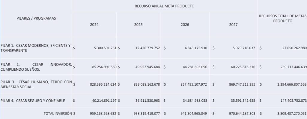 Son $3.8 billones de presupuesto que dispone el Plan Plurianual de Inversiones, recursos que serán distribuidos en cuatro pilares, de acuerdo con la exposición realizada por Cerchiaro: 1. Cesar moderno, eficiente y transparente 2. Cesar innovador, cumpliendo sueños 3. Cesar humano, tejido con bienestar social y 4. Cesar seguro y confiable.