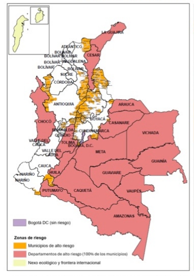 Según la más reciente circular del Ministerio de Salud y Protección Social, el 100% de los municipios de los departamentos de Amazonas, Arauca, Caquetá, Casanare, Cesar, Chocó, Guainía, Guaviare, Huila, La Guajira, Meta, Putumayo, Tolima, Vaupés y Vichada han sido declarados en alto riesgo por fiebre amarilla.