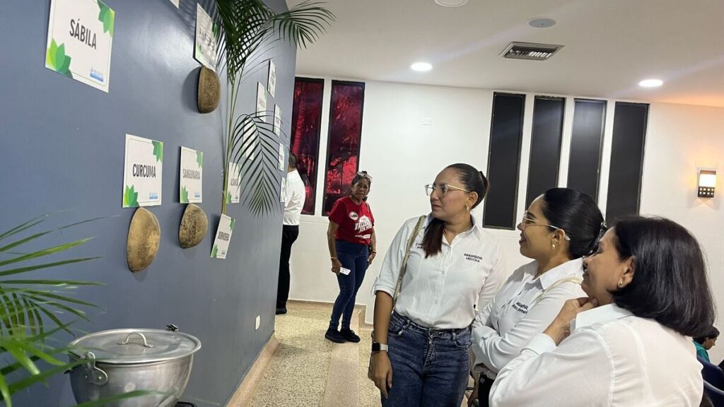 “Las plantas que más utilizamos en el parto son la altamisa y el cogollo de la caña. La altamisa es buena para los baños de vapor y para acelerar el trabajo de parto. El cogollo de caña es sagrado para nosotros. Después del parto, utilizamos la ruda para ayudar a la mujer a expulsar los coágulos de sangre. La sábila también se utiliza como lubricante”, explica la partera, señalando algunas plantas que habían en la pared del auditorio para invitar a conocerlas.