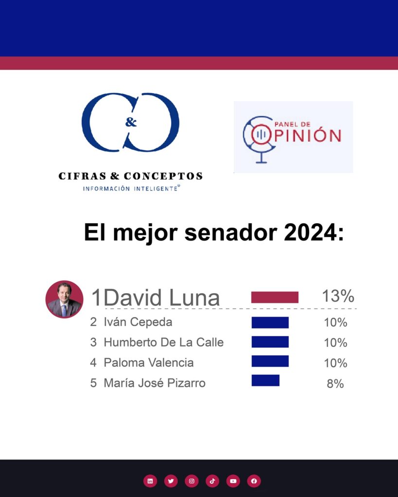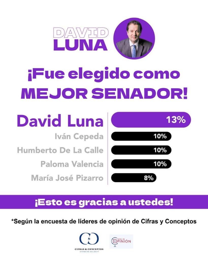 Hoy se dieron a conocer los resultados de la última encuesta de líderes de opinión realizada por la firma Cifras y Conceptos, en donde David Luna ha sido destacado como el mejor senador de Colombia, obteniendo el 13% de la preferencia en este importante sondeo. Esta medición refleja la confianza de la ciudadanía y de los líderes de opinión en su trabajo y compromiso.