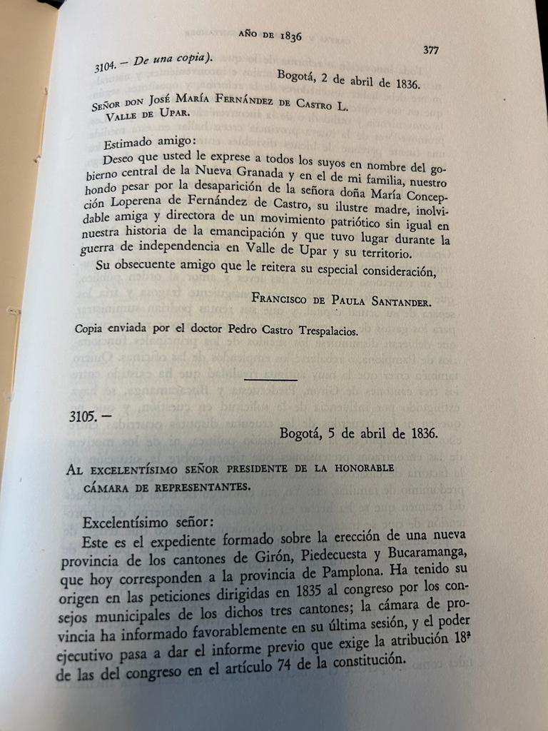 Carta del general Francisco de Paula Santander, presidente de la Nueva Granada, a José Maria Fernández de Castro del 2 de abril de 1836.
