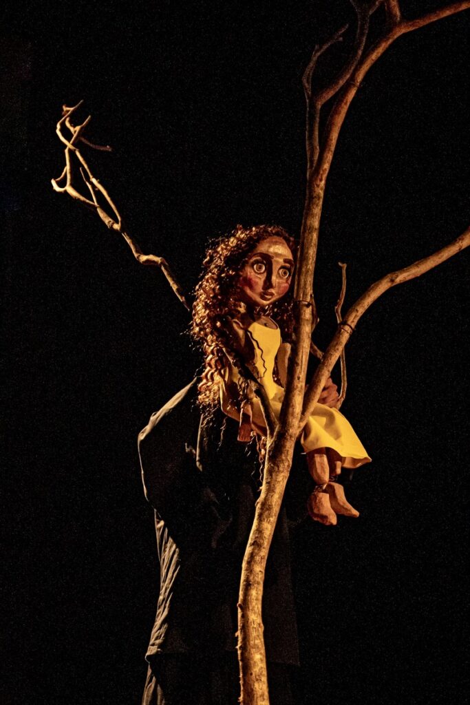 La escenografía, diseñada por Rafael Alberto Moreno, es un ejemplo de cómo lo sencillo puede ser profundamente evocador. Los objetos no son solo utilería, sino parte esencial de la dramaturgia física que caracteriza a Maderos. Las máscaras, elaboradas por Clarisa Cuadros y el artista Carlos Rivero, dan vida a personajes como Negra Falena, Blanca Crezalima, el alabador y el explorador del monte francés, así como a la muñeca Aura y a las máscaras.