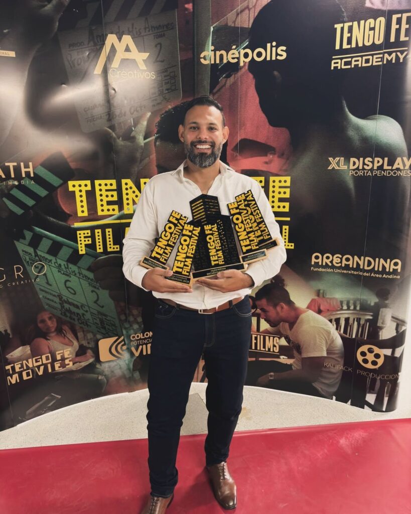 Leonardo Saade, director de ‘Encuéntrame Jack’ con sus cinco estatuillas en Tengo Fe Film Festival. FOTO: TENGO FE FILM FESTIVAL.