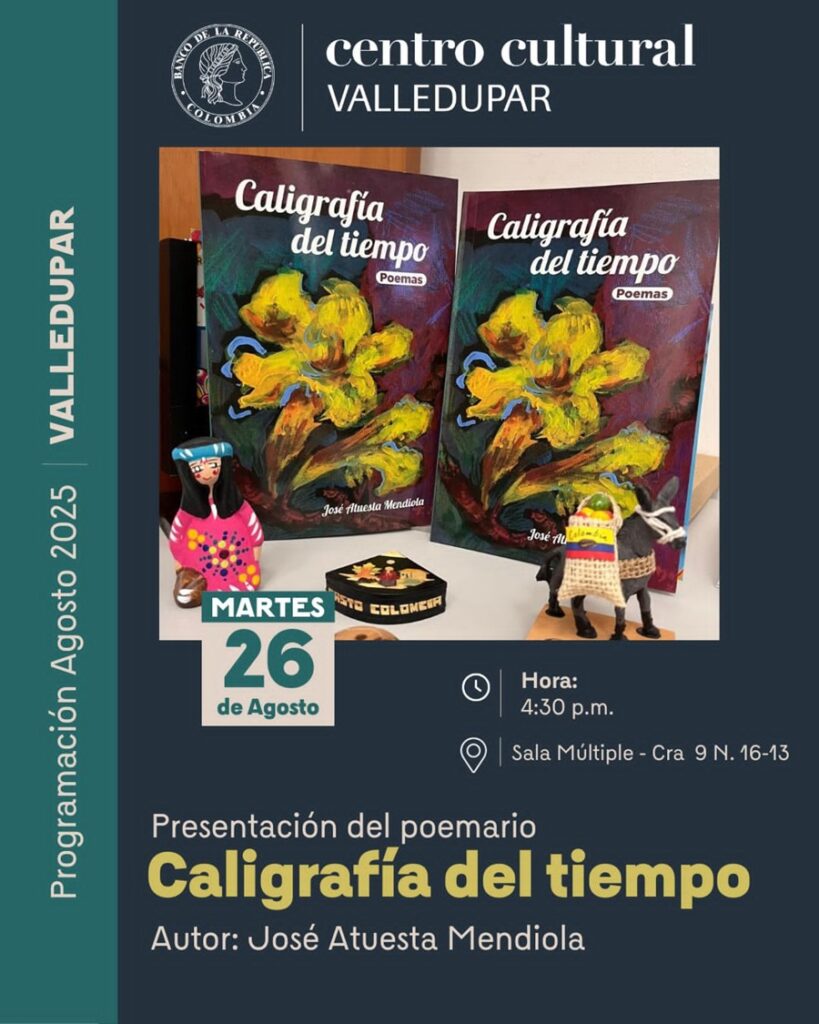 En la Sala Múltiple del Banco de la República de Valledupar, el escritor y docente José Atuesta Mendiola lanzó el libro ‘Caligrafía del Tiempo’, compuesto por 24 poemas reflexivos sobre el medio ambiente y el sentido de la paz, entre otras temáticas. El texto también incluye 30 triadas de caligrafía, descritas como “sabias y profundas”.