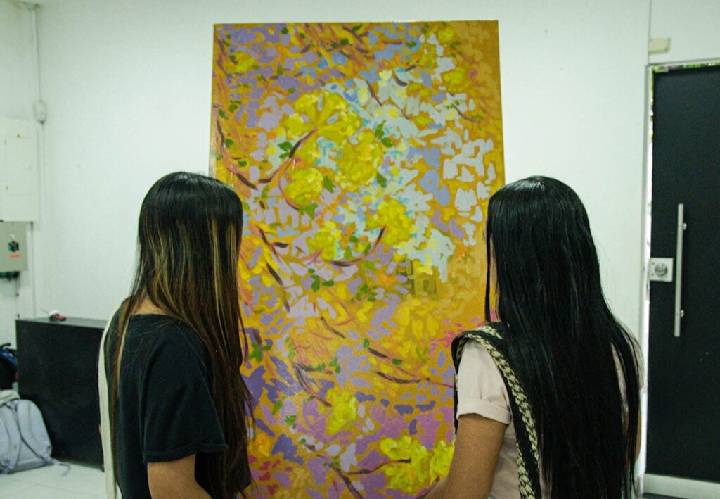 La elección de los cañaguates como motivo central no es casualidad, sino una conexión profunda con la belleza y el simbolismo de esta flor. Turri confiesa: “¿Por qué cañaguates? ¿No te parecen hermosos? Sí, son hermosos”. El color amarillo vibrante de los cañaguates le recuerda al sol, como le expresó su amigo, el poeta William Jiménez: “Los cañaguates es una forma de tener el sol aquí a nuestras manos… un homenaje a esa flor que nos permite ver el sol más cerca “. Actualmente, la muestra se compone de pinturas en acrílico sobre lienzo, aunque el artista se siente especialmente identificado con las técnicas mixtas.