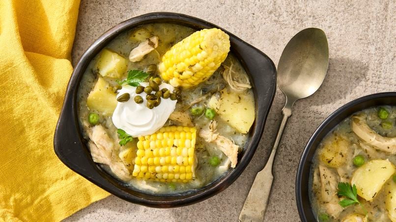 3. Sirve el ajiaco santafereño en 4 platos iguales, agrega encima el pollo desmechado, decora con una cucharada de crema de leche y alcaparras.