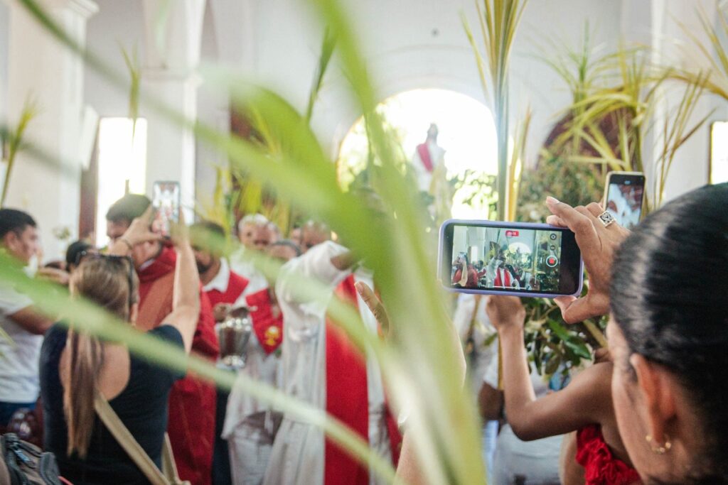 Feligreses capturan con sus celulares el momento solemne de la bendición de los ramos durante la eucaristía del Domingo de Ramos en Valledupar. Foto: Jesús Ochoa.