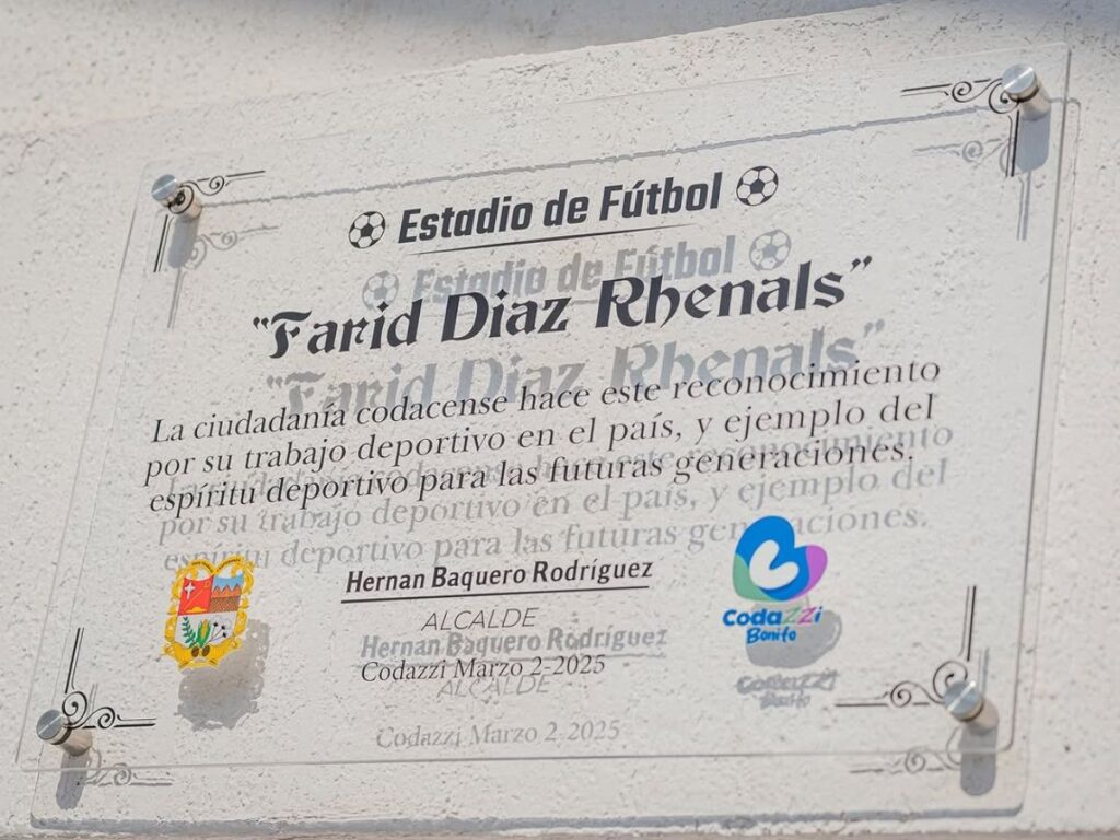 “La ciudadanía codacense, las ligas deportivas de fútbol más importantes de Codazzi, hoy dijeron, queremos ponerle un nombre al estadio local, ese nombre lo hemos dado a la persona que nos ha representado a nivel local, departamental, nacional y a nivel mundial. Farid Díaz Rhenals es un futbolista codacense que hizo parte de Atlético Nacional, que nos representó en Paraguay a nivel internacional, que fue campeón no solamente de la liga nuestra, aquí en Colombia, sino también de la Libertadores, que nos representó en la selección Colombia y que pudo estar en el mundial. Hoy Farid Díaz, como muchos otros deportistas, representa el sentir y el glamor de lo que nosotros queremos hacer aquí en Codazzi con tantos jóvenes talentosos”, expresó el alcalde.