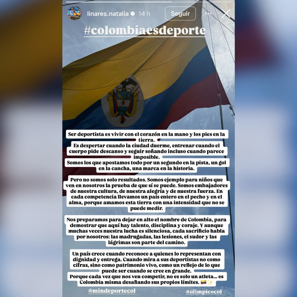 “Ser deportista es vivir con el corazón en la mano y los pies en la tierra. Es despertar cuando la ciudad duerme, entrenar cuando el cuerpo pide descanso y seguir soñando incluso cuando parece imposible… Nos preparamos para dejar en alto el nombre de Colombia, para demostrar que aquí hay talento, disciplina y coraje… Porque cada vez que nos ven competir, no es solo un atleta… es Colombia misma desafiando sus propios límites”, decía parte del mensaje.