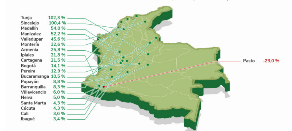 En el comportamiento del abastecimiento por ciudades, la Central de Abastos de Valledupar (Mercabastos) registró una variación positiva del 45 % respecto de enero de 2023, siendo el quinto mayor porcentaje del país, seguido de Tunja (102 %), Sincelejo (100 %), Medellín (54 %) y Manizales (52 %).