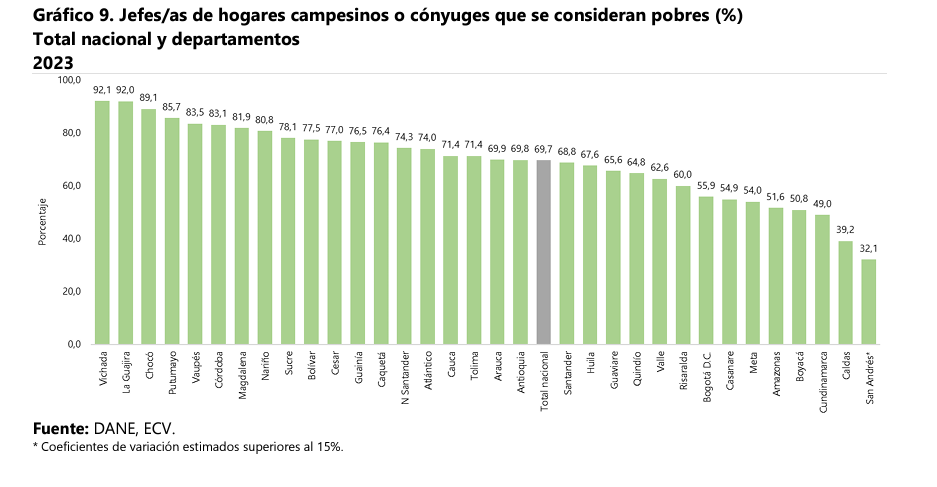 Vichada (92,1 %), La Guajira (92 %) y Chocó (89,1 %) son los departamentos donde el mayor porcentaje de campesinos se consideran pobres.