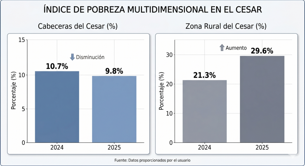 El rezago más marcado del departamento se concentra en el campo, evidenciando una profunda brecha de desigualdad territorial. Mientras a nivel nacional la pobreza en las zonas rurales logró reducirse, el panorama en el Cesar fue de franco retroceso.