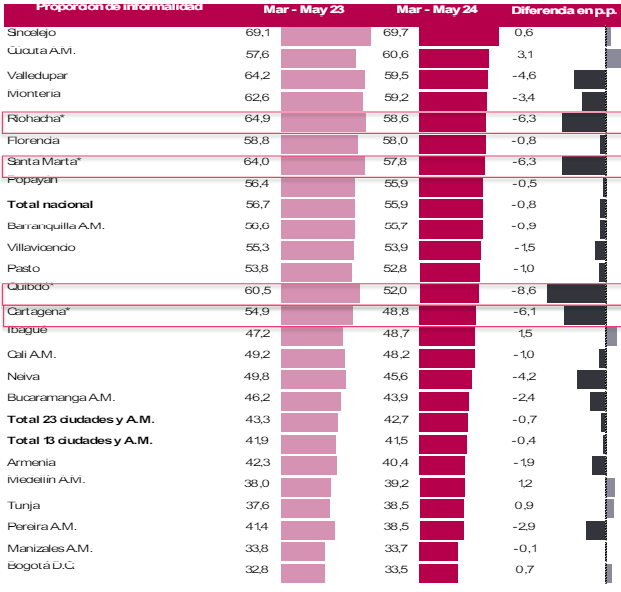 Frente al mismo periodo, pero del 2023, el desempleo en la ciudad tuvo una reducción de -2,3 %, comportamiento a la baja que también se presentó en la la proporción de población ocupada de manera informal que pasó de 64,2 % en mayo de 2023 a 59,5 % hasta la misma mensualidad en 2024.