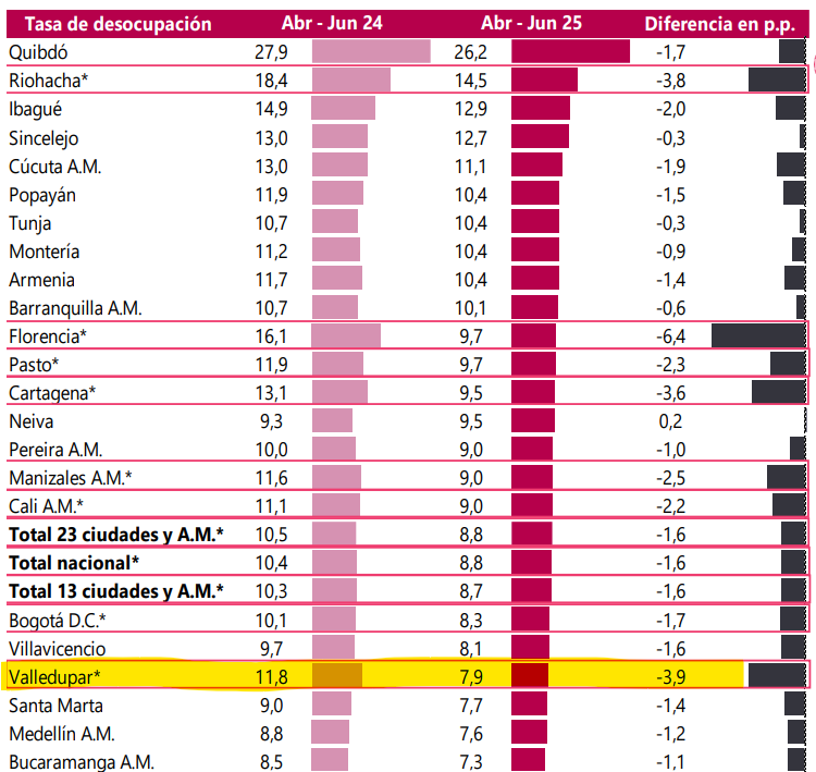 Valledupar vive un momento de notorios cambios en su mercado laboral: para el trimestre abril-junio de 2025, la ciudad registró una de las tasas de desempleo más bajas del país, con un 7,9 %, considerablemente por debajo del promedio nacional de 8,6 % y del promedio de las 13 principales ciudades y áreas metropolitanas, que fue de 8,3 % en este mismo período.