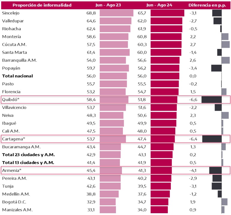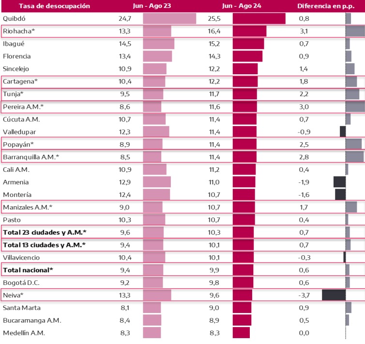 El informe de la entidad muestra que para el trimestre junio-agosto la desocupación en la capital cesarense fue de 11,4 % (-0,9 % frente al mismo periodo de 2023) mientras que el total nacional, en ese lapso, fue de 9,9 %, lo cual refleja una diferencia de 1,5 % desde el panorama local frente al nivel general, el cual tiene en cuenta los resultados de 23 ciudades.