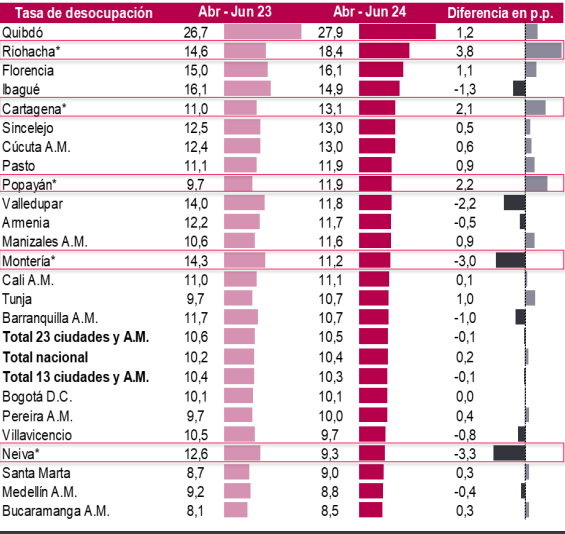 Así mismo, para el mes de junio de 2024, la tasa de desocupación del total nacional fue 10,3%, lo que significó un aumento de 0,9 puntos porcentuales respecto al mismo mes de 2023 (9,3%). Frente a ese porcentaje de todo el país, Valledupar está 1,4 % por encima.