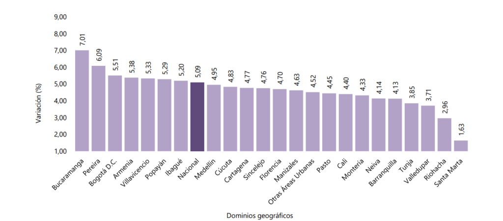 Las 3 capitales están por debajo del promedio nacional que fue de 5 %, y la ciudad con mayor aumento en el costo de vida, que fue Bucaramanga (7 %). A nivel nacional, los restaurantes y hoteles (7,34 %), la educación (7,27 %), la categoría de alojamiento, agua, electricidad, gas y otros combustibles (6,29 %) fueron las que movieron los precios hacia arriba.