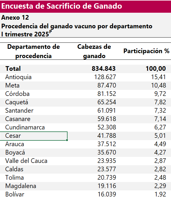 El boletín técnico detalla que las mayores participaciones en el sacrificio de vacunos en el primer trimestre de 2025, se registraron en Bogotá (16,3 %), Antioquia (13,0 %), Santander (9,7 %), Córdoba (7,8 %) y Valle del Cauca (6,3 %).