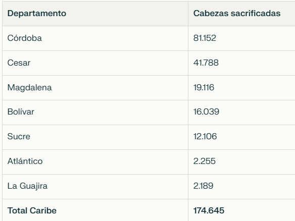 Esto quiere decir que de las más de 174.000 cabezas de ganado vacuno que el Dane contabilizó durante ese período en esta región del país, los dos departamentos aportaron más de 122.900 cabezas, principalmente Córdoba, con 81.152 destacándose con la mayor oferta, mientras que el Cesar se destacó en segundo lugar con 41.788 cabezas, es decir, cerca del 24 % del total caribeño.