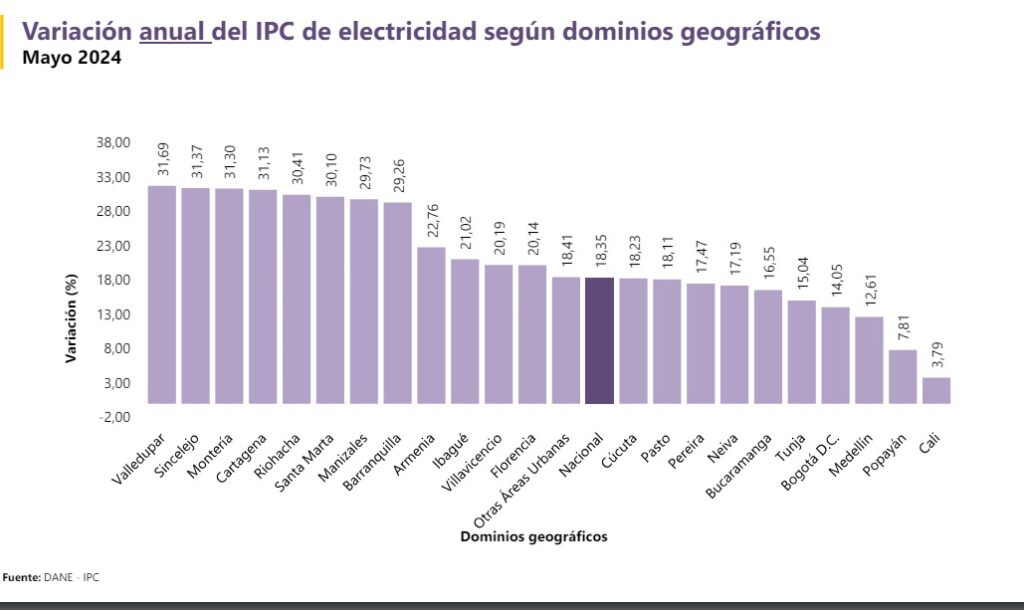 Las altas tarifas de la energía también afectan a las ciudades del Caribe, las cuales completan el top 5 de los territorios con mayor índice de inflación del último año: Sincelejo (8,4 %), Riohacha (8,2 %), Montería (8,2 %) y Cartagena (8,1 %).