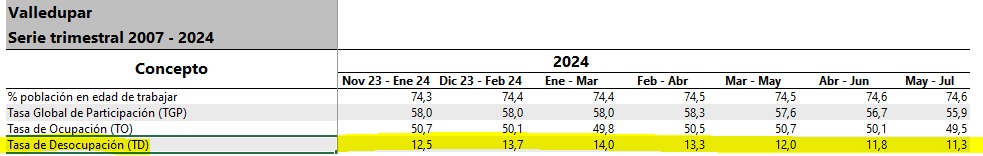 Al compararse con los trimestres anteriores del 2024, este es el porcentaje más bajo de desempleo que ha tenido el municipio durante el año, puesto que en junio el indicador fue de 11,8 %; en mayo de 12 %; en abril de 13,3 % ; en marzo de 14 %; en febrero de 13,7 % y en enero de 12,5 por ciento.