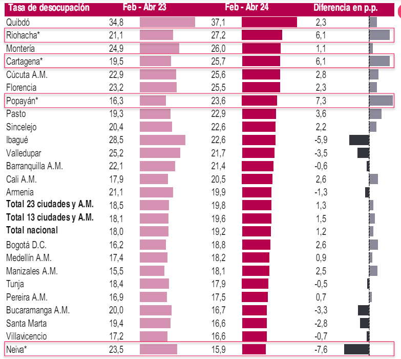 No obstante, a nivel Caribe registra tasas menores que Riohacha (27,1%), Montería (26 %), Cartagena (25,7 %) y Sincelejo (22,6 %). Por su parte, las ciudades con menor porcentaje de jóvenes desempleados en esta región son Santa Marta (16, 6 %) y Barranquilla (21,4 %).