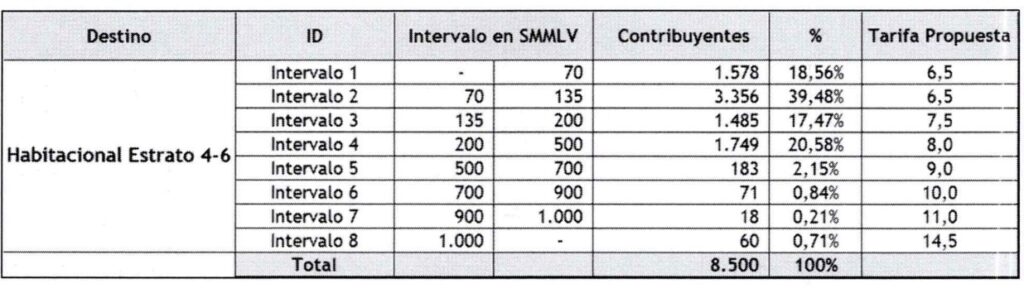En el caso de los predios de uso habitacional en los estratos 4, 5 y 6, sin estrato, los predios comerciales, industriales, agropecuarios, lotes urbanizables no urbanizados, lotes urbanizables no edificados y otros, la tarifa incrementa aproximadamente medio punto en todas las categorías, de acuerdo al intervalo en salario mínimo legal vigente, quedado así: (ver cuadro 1).