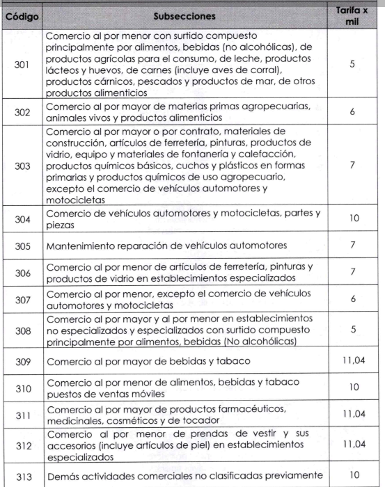 Ahora bien, las modificaciones en el impuesto de industria y comercio planteadas son, en primer lugar, pasar de 413 actividades  a 32 subsecciones, en cuanto a la tarifa, la Alcaldía propuso un aumento para las actividades financieras y sus instituciones que actualmente es de 11×1.000 y se pretende elevar a 14×1.000.
