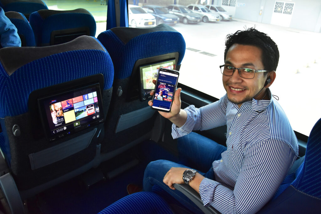 A bordo de los buses se pueden ver películas, series o escuchar música con las pantallas o desde el celular con el sistema streaming.