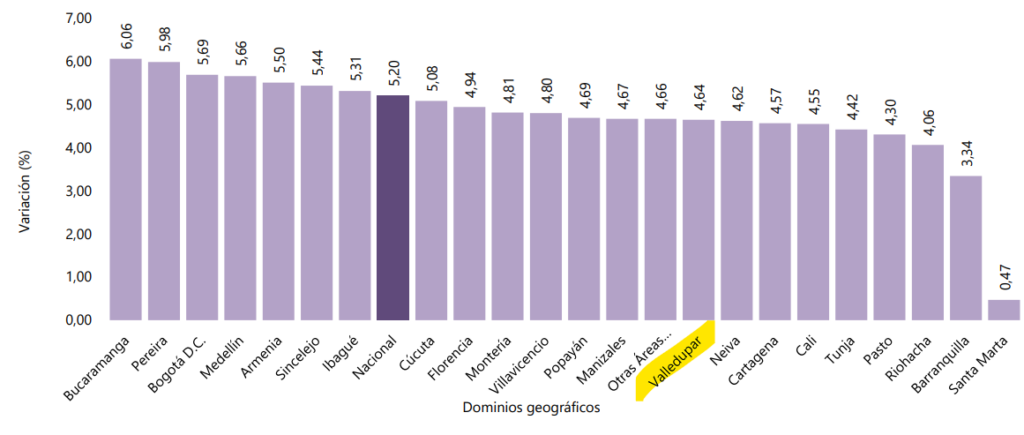 El incremento general de los precios en los productos y servicios en Valledupar entre diciembre de 2023 y el mismo mes de 2024 fue de 4,6 %, uno de los porcentajes más bajos de Colombia, de acuerdo con el Índice de Precios al Consumidor (IPC) que mide el Departamento Administrativo Nacional de Estadística, Dane.