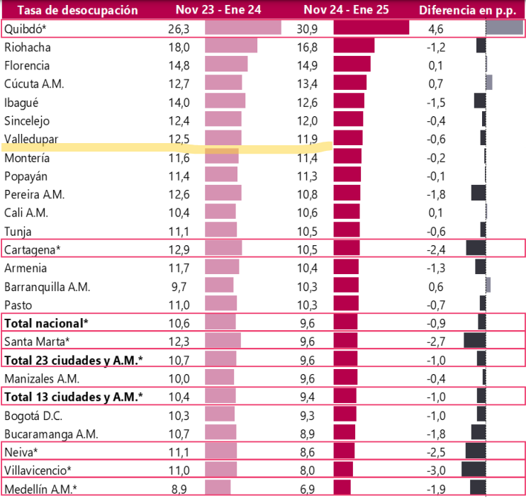 El Departamento Administrativo Nacional de Estadística (DANE) publicó el informe del mercado laboral del trimestre noviembre de 2024-enero de 2025, exponiendo una tasa de desocupación del 11,6 % para total nacional en Colombia, mientras que el porcentaje de Valledupar fue de 11,9 para el mismo período.
