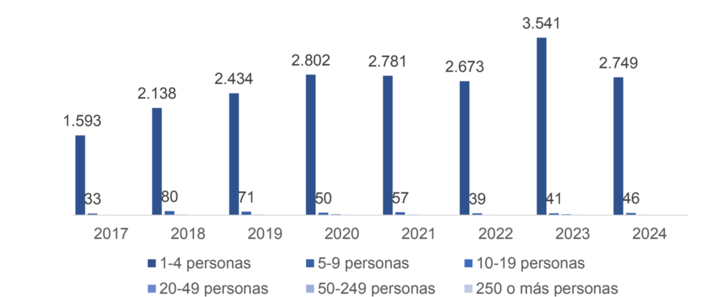 Respecto a las de 2024, el 98 % eran microempresas, por lo menos 1.351 del sector comercio, 565 de servicios de comida y alojamientos, y 229 de la industria manufacturera. Las 3 actividades económicas que menos salidas de empresas tuvieron fueron la de suministro de electricidad, gas, vapor y aire acondicionado (3); explotación de minas y canteras (6) y las de financieras y seguros (21).