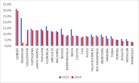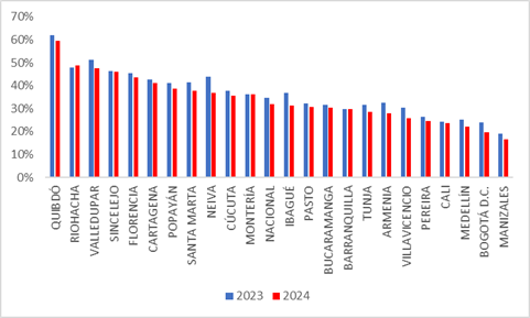 Desde la perspectiva de ciudades, Bogotá explicó alrededor de 28 % de la reducción nacional, gracias a su política de Ingreso Mínimo Garantizado (IMG). Los resultados muestran heterogeneidad urbana estructural dado que, mientras Quibdó exhibe 59,6 % de población en situación de pobreza monetaria y Riohacha 48,8 % (única ciudad que registró aumento en 2024 con respecto a 2023), Bogotá y Manizales muestran indicadores de 19,6 % y 16,7 %, respectivamente (Figura 1).