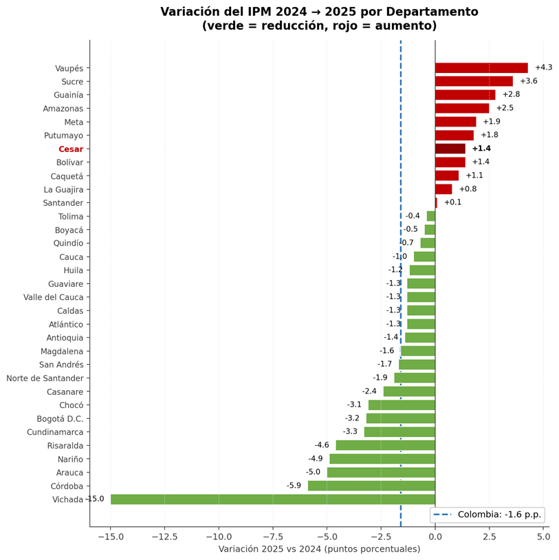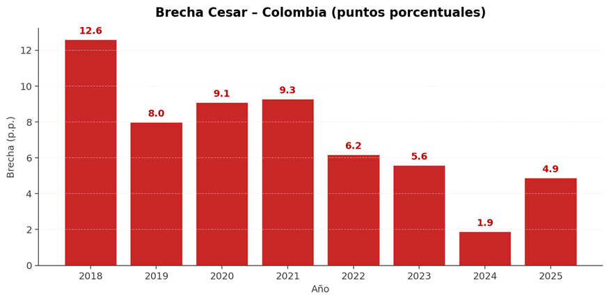 La brecha (Cesar menos Colombia, en p.p.) había venido cerrándose desde 2018 hasta 2024, pasando de 12,6 p.p. a apenas 1,9 p.p. En 2025 la brecha vuelve a abrirse hasta 4,9 p.p., producto del repunte del Cesar combinado con la continua reducción del IPM nacional.