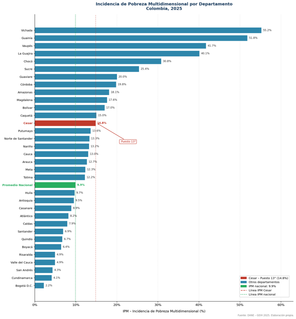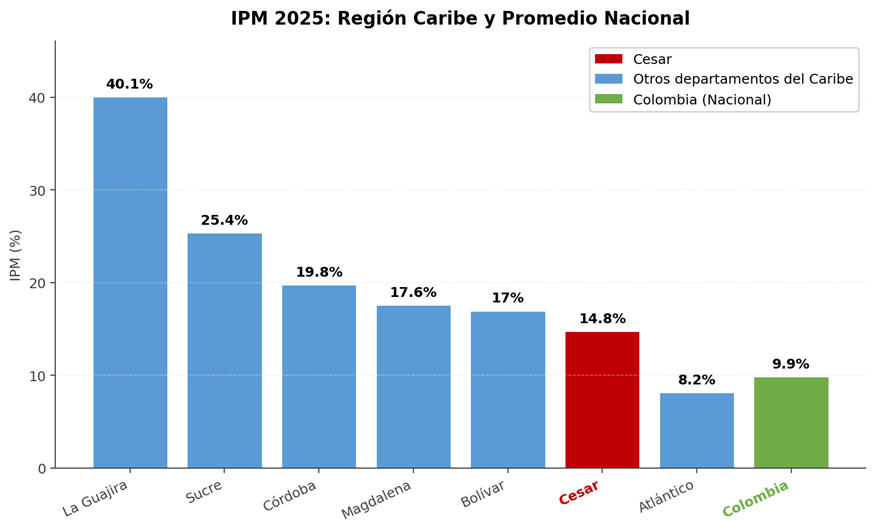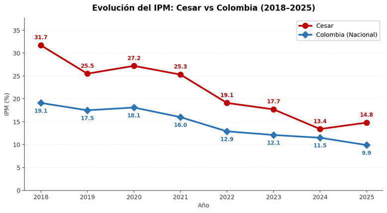 Entre 2018 y 2024 tanto el Cesar como Colombia redujeron su IPM de manera sostenida, con un repunte puntual durante la pandemia (2020). En 2025 las trayectorias divergen: Colombia continúa descendiendo y marca su mínimo histórico (9,9%), mientras que el Cesar repunta (14,8%), lo que amplía nuevamente la brecha entre el departamento y el promedio nacional.