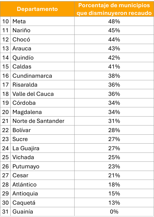 En particular, el Cesar forma parte del grupo de departamentos donde al menos una quinta parte de sus municipios ha visto reducir sus ingresos reales por concepto de impuesto predial y sobretasa ambiental. Esto contrasta con regiones como Atlántico y Antioquia, donde la caída afecta menos del 20 % de los municipios.