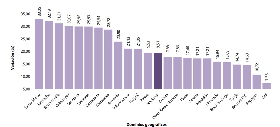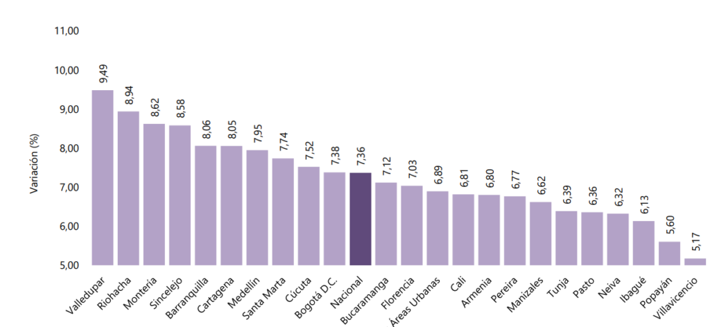 Esta medición de la entidad estadística entre marzo de 2023 y marzo de 2024 las lideran las ciudades del Caribe colombiano. En segundo lugar está Riohacha (8,94), seguida de Montería, Sincelejo, Barranquilla, y Cartagena, territorios afectados por las altas tarifas del servicio de energía eléctrica.