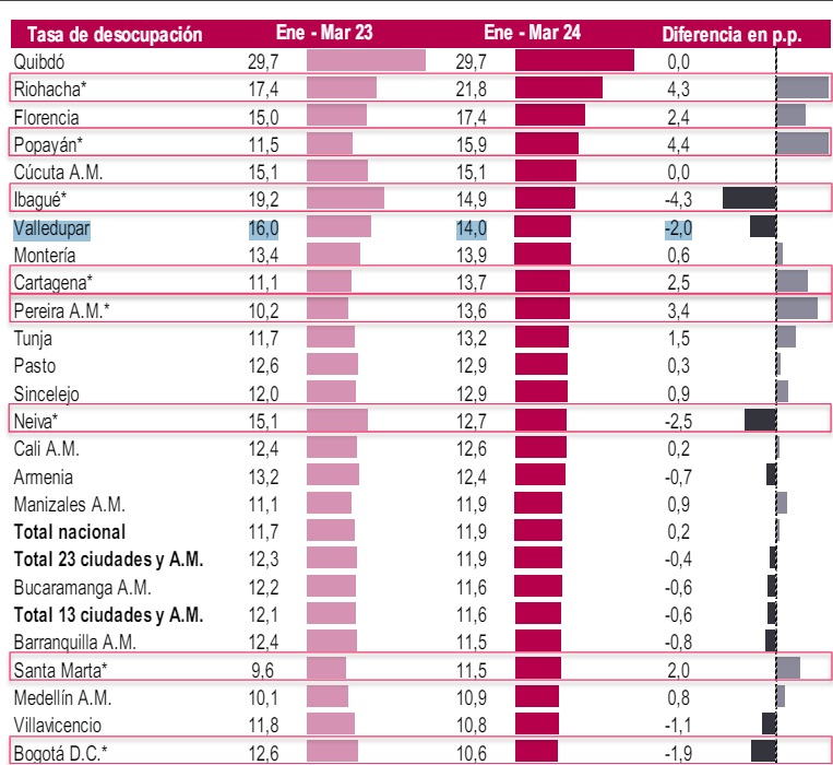 El nuevo informe del mercado laboral publicado por el Departamento Administrativo Nacional de Estadística (DANE) para el trimestre enero-marzo del 2024 muestra una reducción de dos puntos porcentuales en la tasa de desempleo de Valledupar respecto al mismo periodo del 2023.